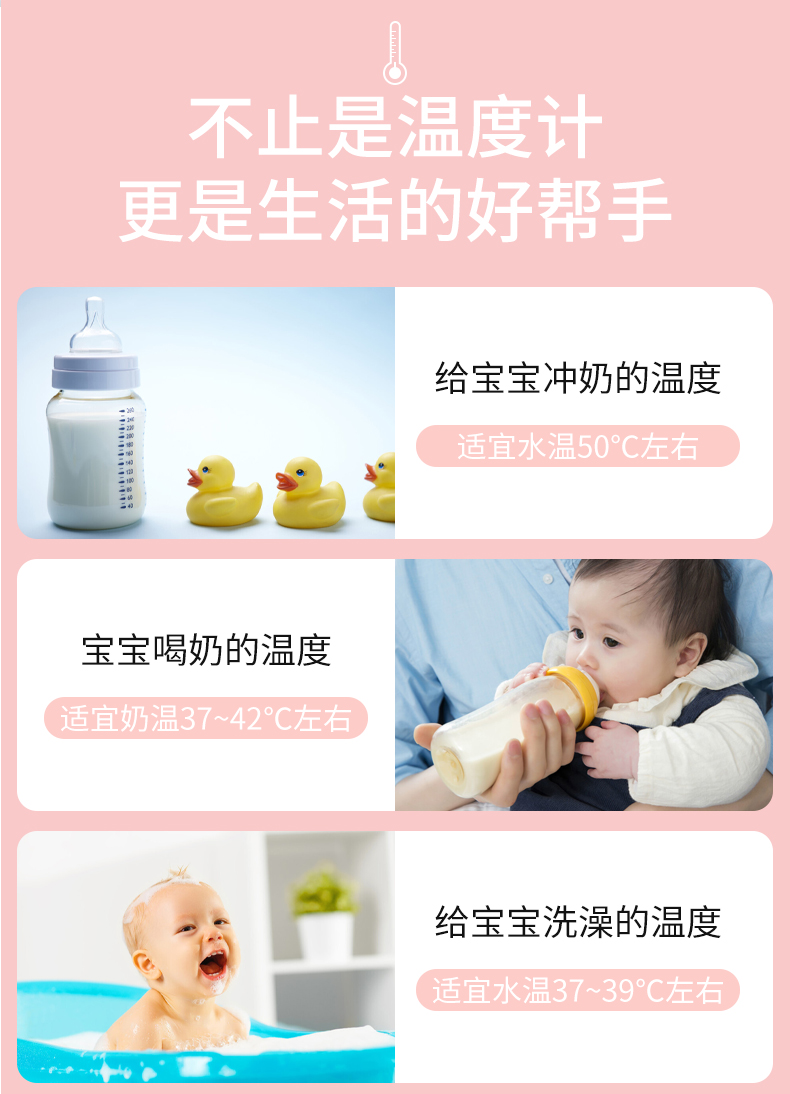 食品温度计种类繁多,大部分都是采用探针式进行测温,也有机械刻度式物理测温,和红外激光测温,而探针式深入食品内部探测温度,测量更加准确,它不只是一个简单的温度计,更是生活的好帮手,比如给宝宝冲奶粉适宜的水温是在50℃左右,宝宝喝奶适宜的奶温在37~42℃左右,给宝宝洗澡适宜的水温是在37~39℃左右,还有冲泡蜂蜜水的温度在50~60℃之间,这样的水温冲泡蜂蜜使得蜂蜜的营养氨基酸不被破坏;烫类饮用的温度在60~65℃,高于70℃的话,对舌头咽喉肠胃不好,很容易引起疾BI;或者炸油条时候的油温在200℃,过高的油温,很容易使得外焦内不熟的现象等等。