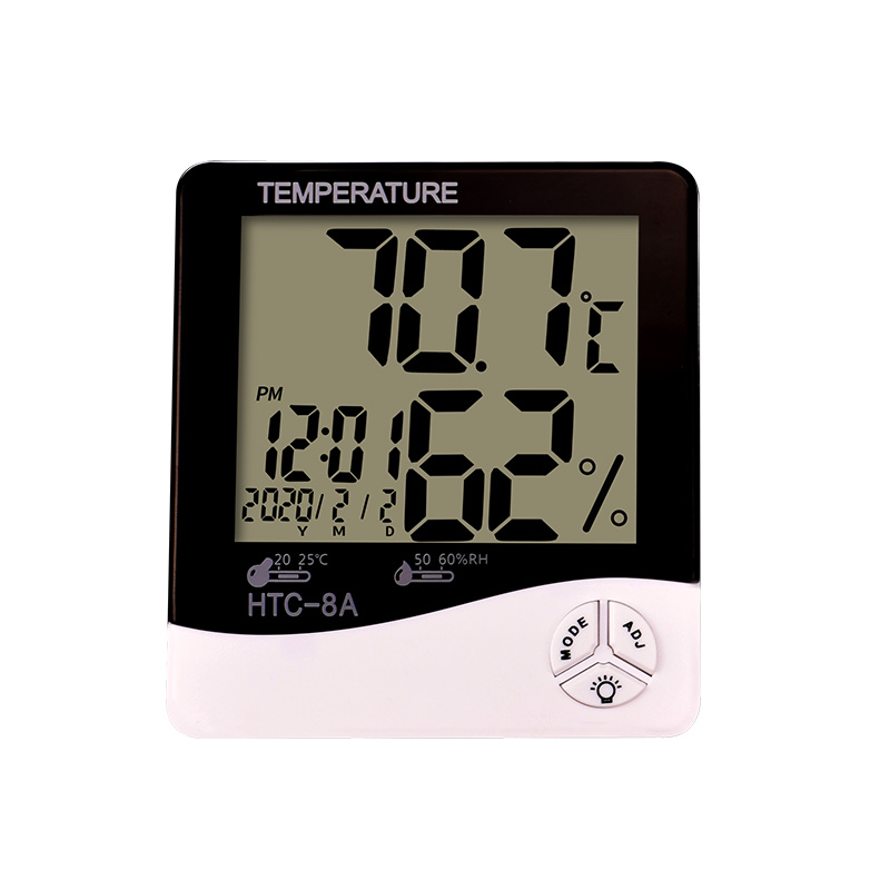 HTC-8A为一款家用多功能温湿度计,具有5s背光功能,温湿度、时间日期同屏显示,闹钟和整点提醒功能, 记忆最大最小温湿度值,12/24小时制切换,温度单位℃/℉切换。