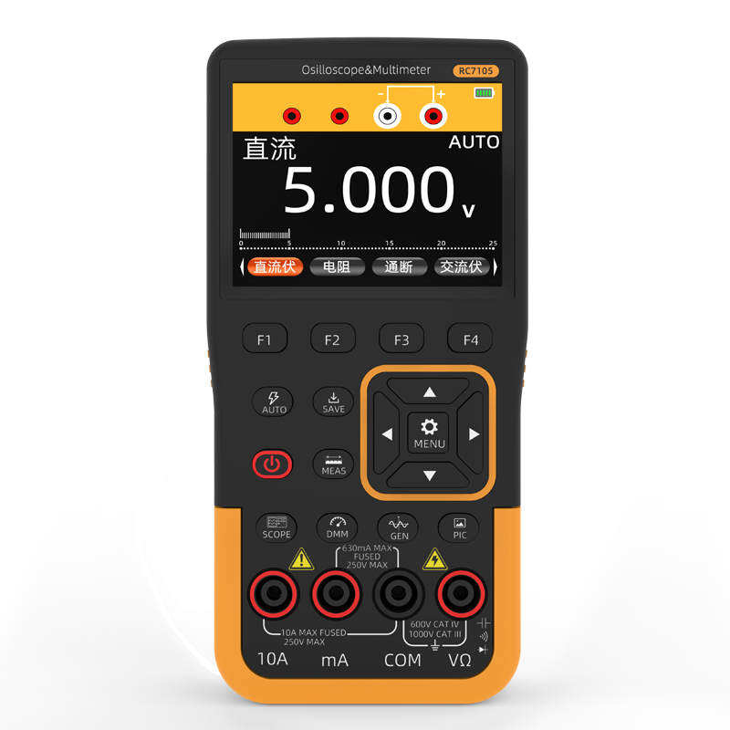 RC7105 是一款集数字示波器、函数信号发生器和万用表功能于一体的便携式多功能测试仪器,适用于电子电路调试、教学实验、工业检测等多种场景。